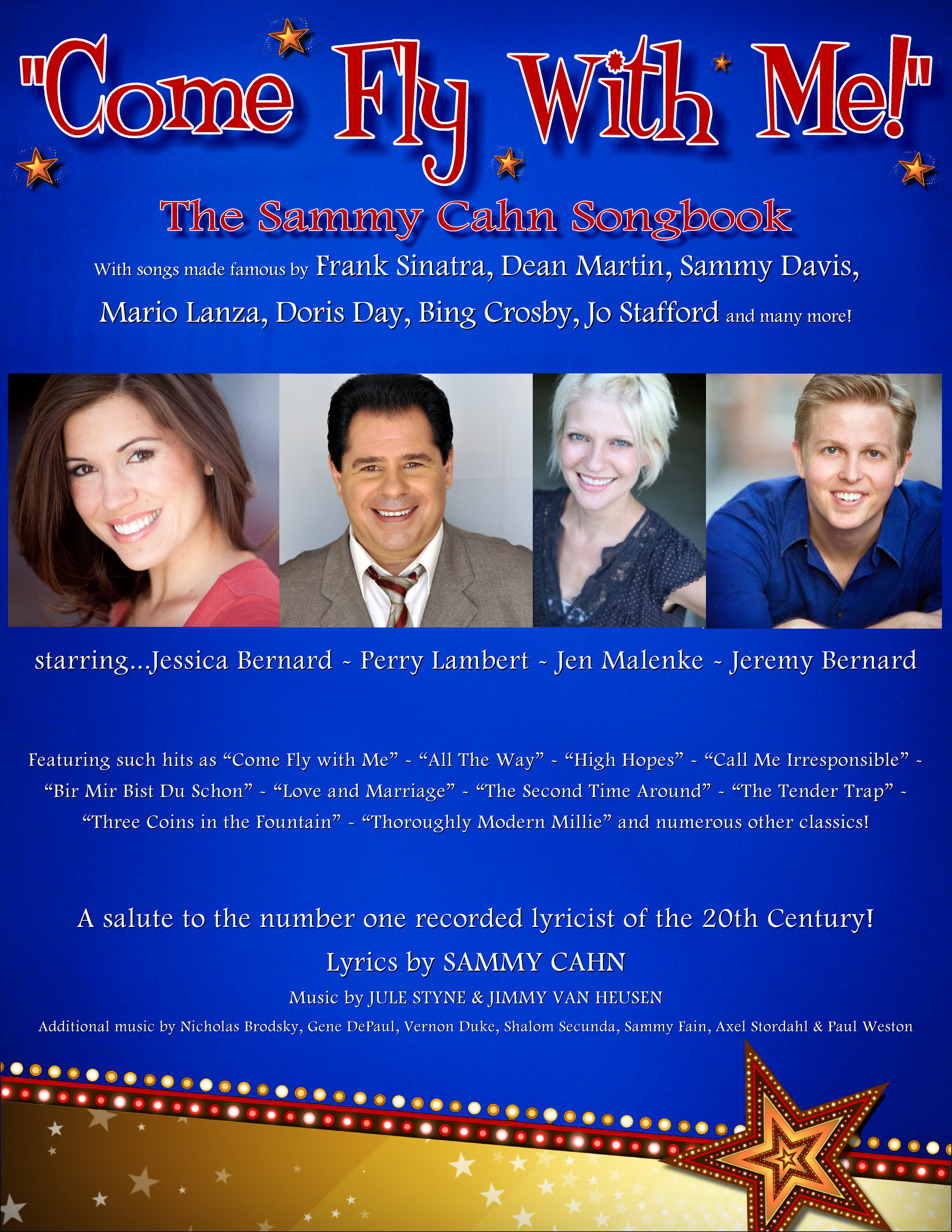 "sammycahnsongbook.com" "comeflywithme-theshow.com", is a Trademark and Copyright of Perry Lambert © 1999-2016. Materials, text, graphics, images and otherwise are trademarks and copyrights of Kissing Bandit Productions © 1996-2016. Reserved under International Copyrights conventions. No part of this site may be reproduced, transmitted, or utilized in any form or by any means, electronic, and mechanical including photocopy, recording, or any other information storage and retrival system without prior permission in writing from the producers. Violators will be prosecuted to the fullest extent of the law....So there.